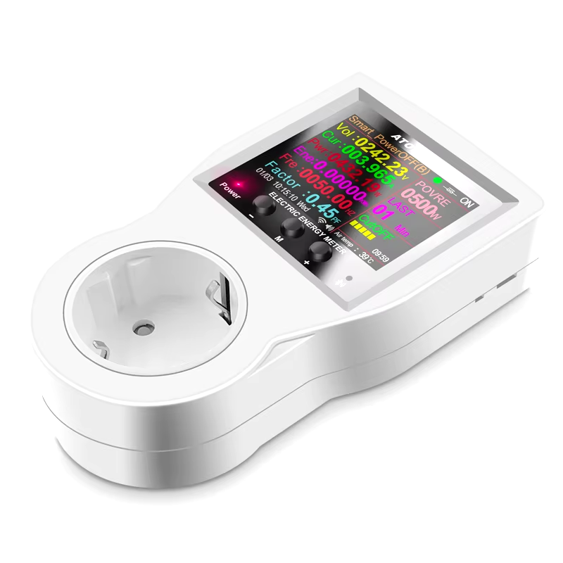 - Відображення параметрів: напруга, струм, споживана потужність у реальному часі, загальна енергія, частота, реактивність навантаження, час роботи